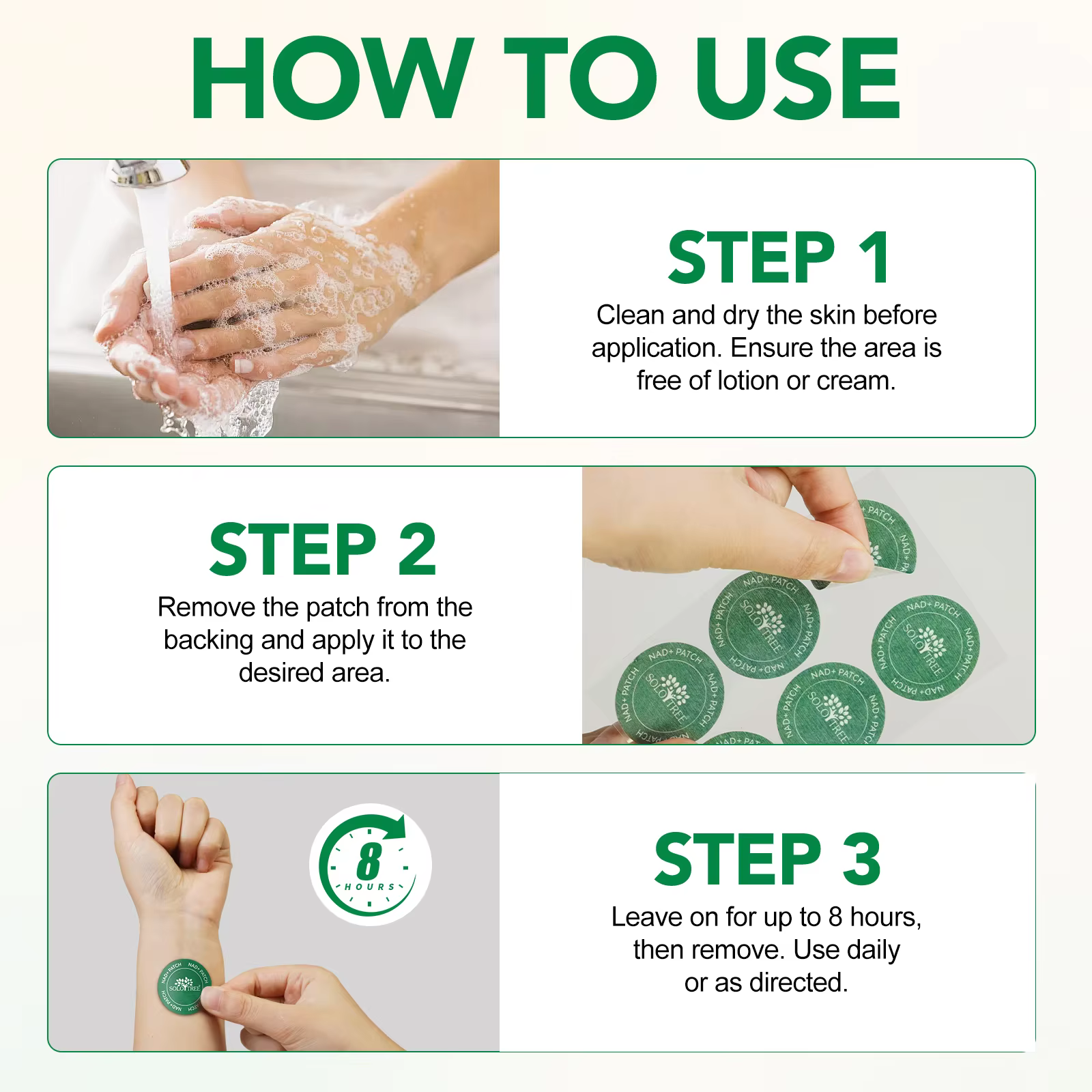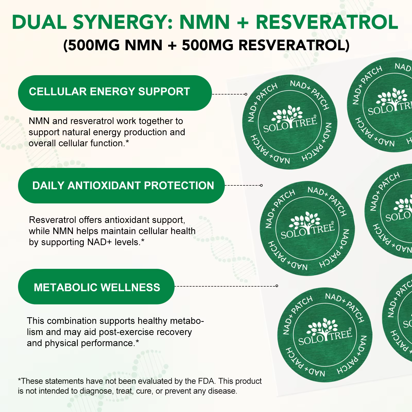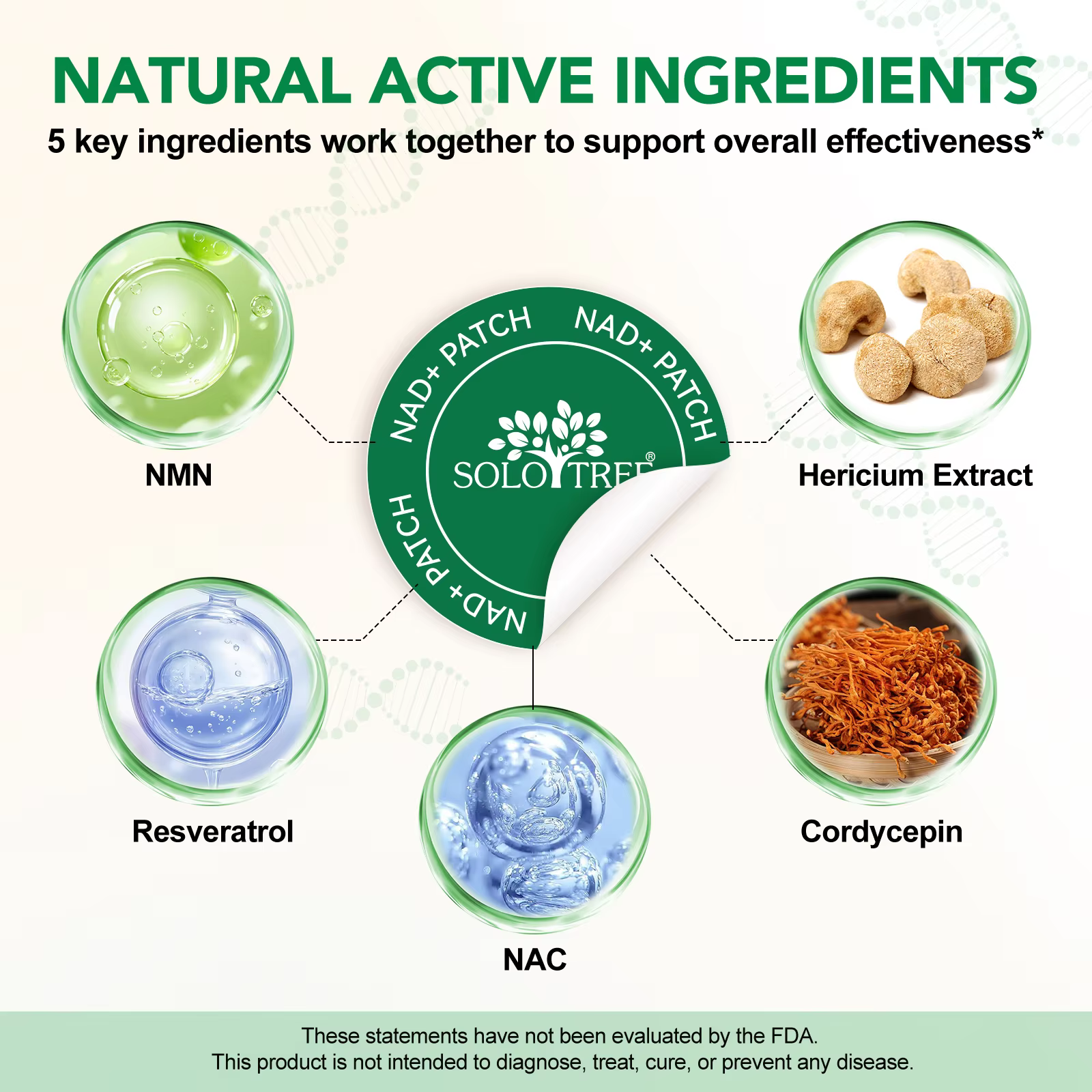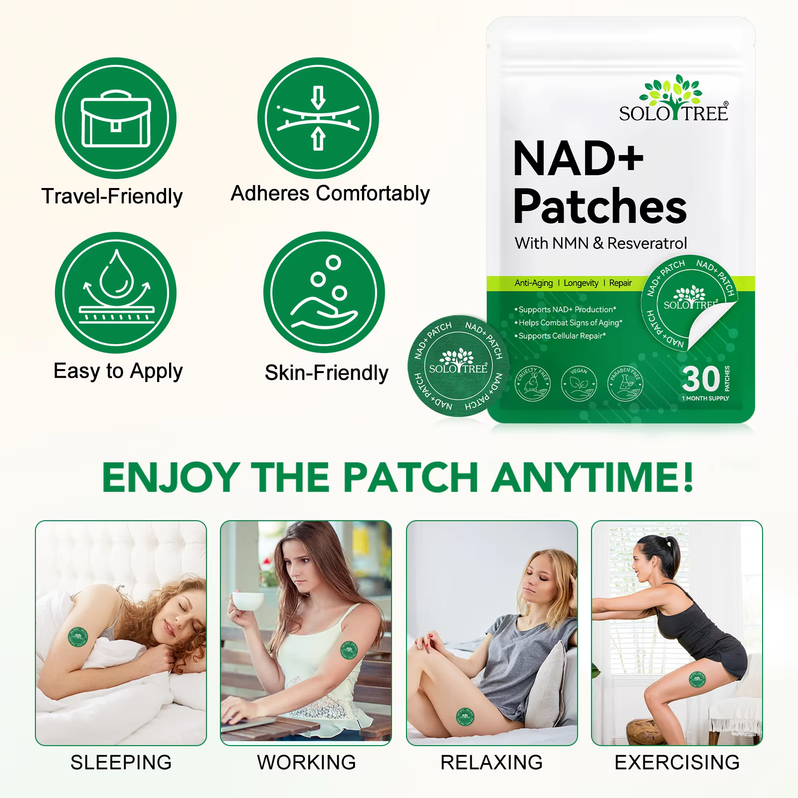 Solotree NAD+ Patches support cellular repair and NAD+ production, featuring key ingredients like Resveratrol and NMN for enhanced wellness.